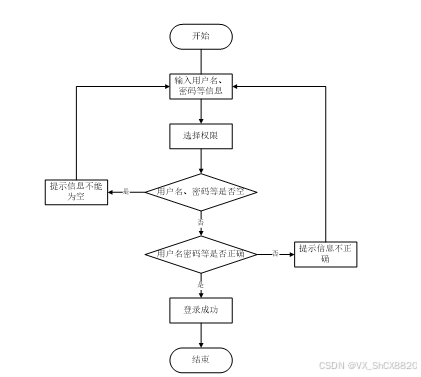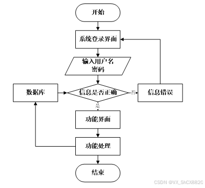用户打开并进入系统后,会先显示登录界面,输入正确的用户名和密码,系统自动检测信息,若信息无误,则用户会进入系统功能界面,进行操作,否则会提示错误无法登录,操作流程如图2-3所示。
