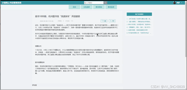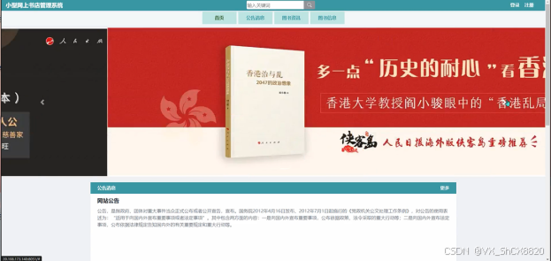 首页: 展示最新的公告消息和图书资讯,引导用户进入相关功能模块。