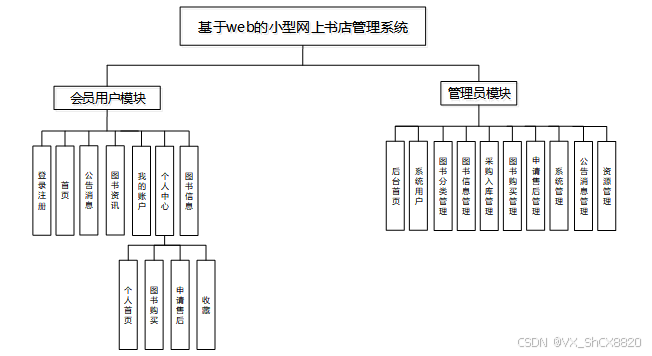 按照基于web的小型网上书店管理系统的角色,系统划分为了会员用户模块和管理员模块这两大部分。