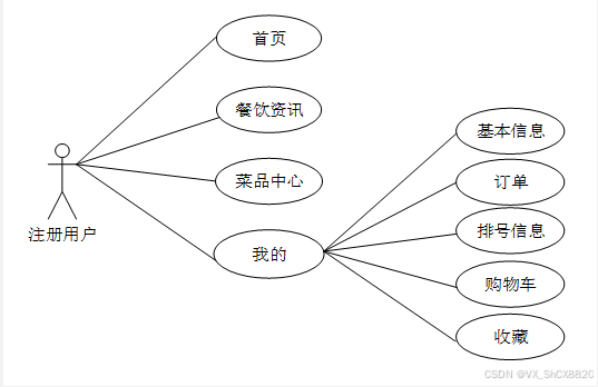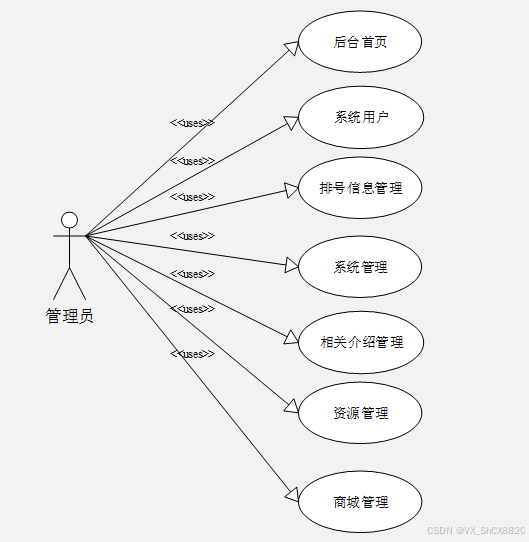 基于微信小程序点单系统基于现有的手机,可以实现管理员:后台首页、系统用户、排号信息管理、系统管理、相关介绍管理、资源管理、商城管理等功能。根据系统功能需求建立的用例关系图如下图: