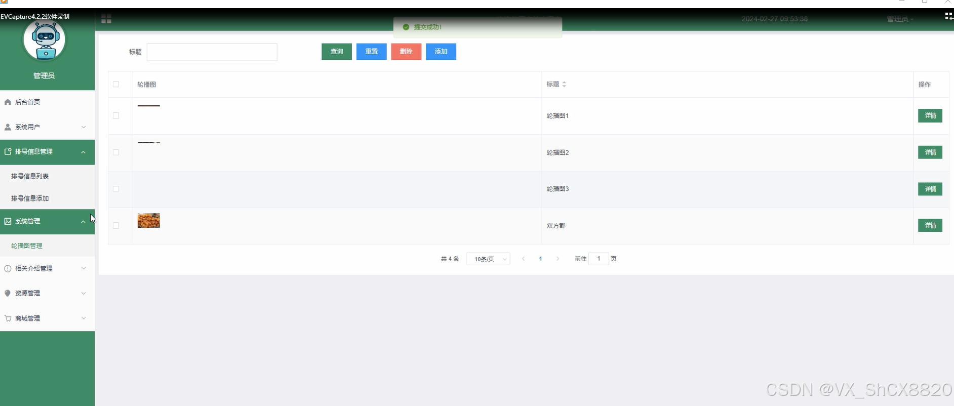 系统管理,管理员可以对系统前台展示的轮播图增删改查,方便用户进行查看。系统管理界面如下图所示。