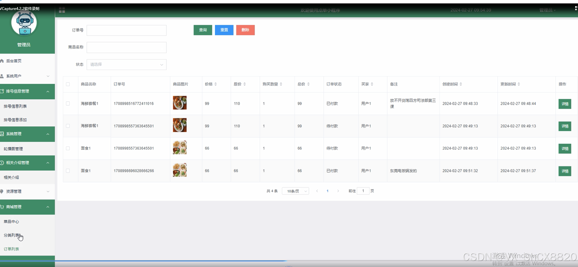 订单列表,管理员可以查看商品名称、订单号、商品图片、价格、原价、购买数量、总价、订单状态、买家备注、创建时间、更新时间等信息。支持通过输入订单号和商品名称进行查询、重置和删除的操作,如下图所示。