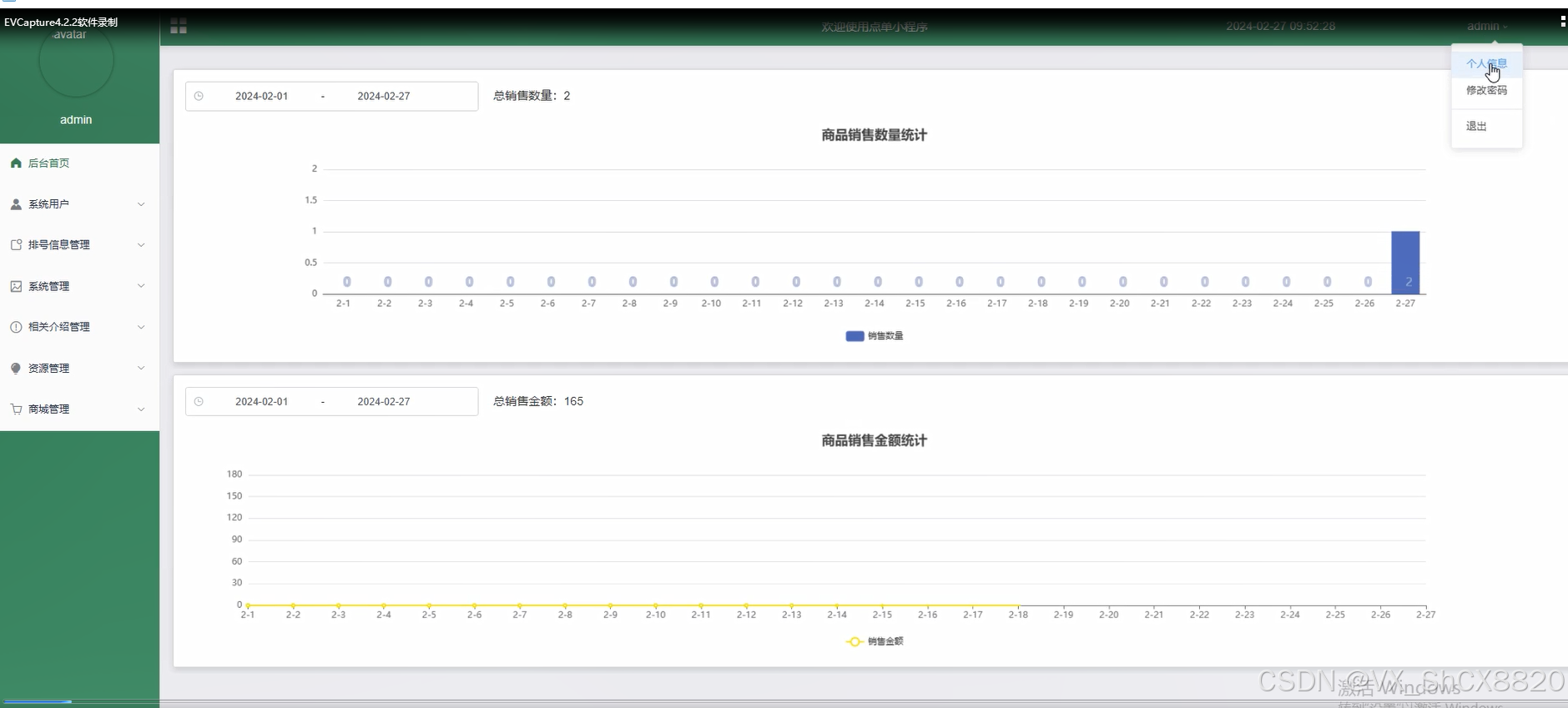 后台首页:管理员登录后可以访问后台首页,以查看系统的整体运行情况,包括订单数量、销售情况、排号信息、系统消息等数据统计信息。