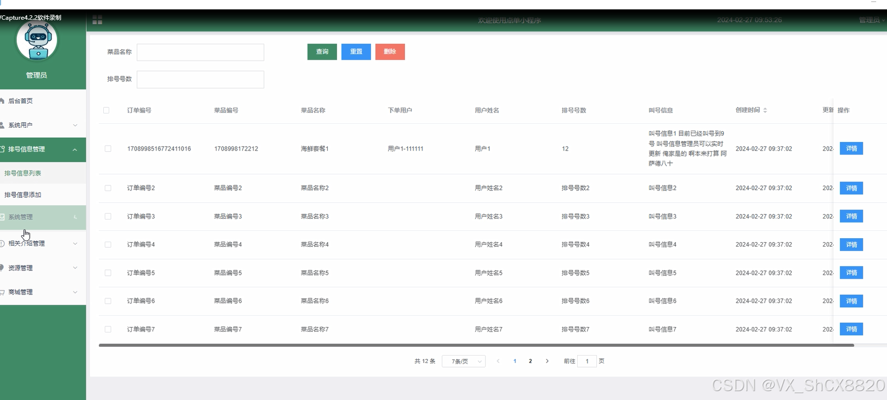 排号信息管理,管理员可以排号信息列表和排号信息添加进行增添改查,排号信息管理界面如下图所示。