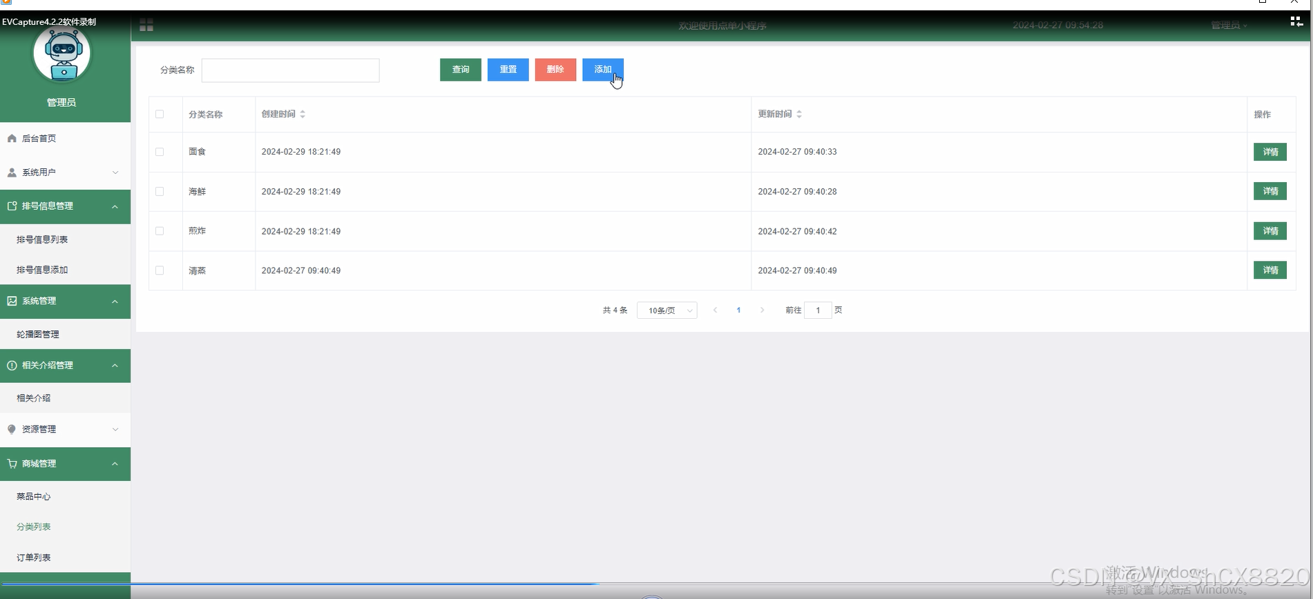 分类列表,管理员可以查看分类列表的创建时间、更新时间。通过输入分类列表信息进行查询、重置、添加和删除等操作。如下图所示。