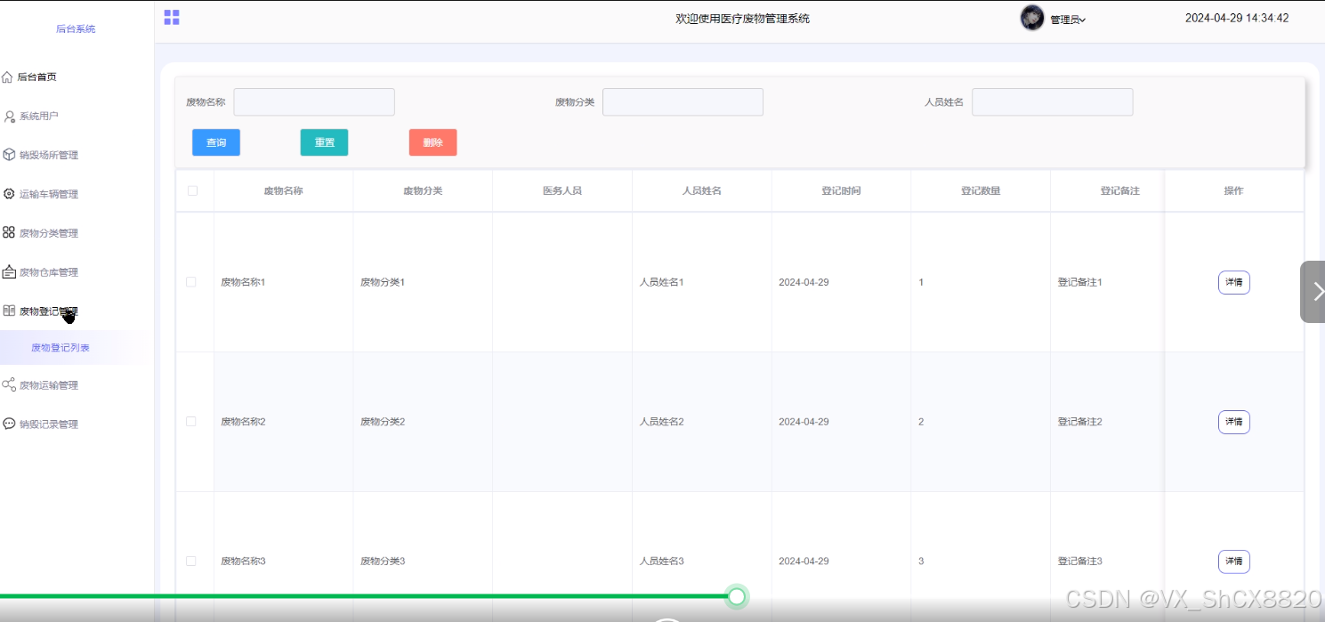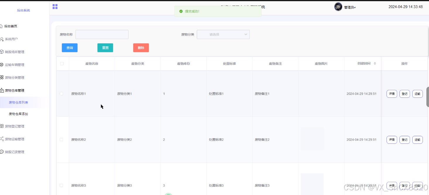 管理员需要能够查看和管理废物的登记信息,包括废物的产生、处理情况等,以便进行废物的追踪和监管。界面如下图4-11所示。