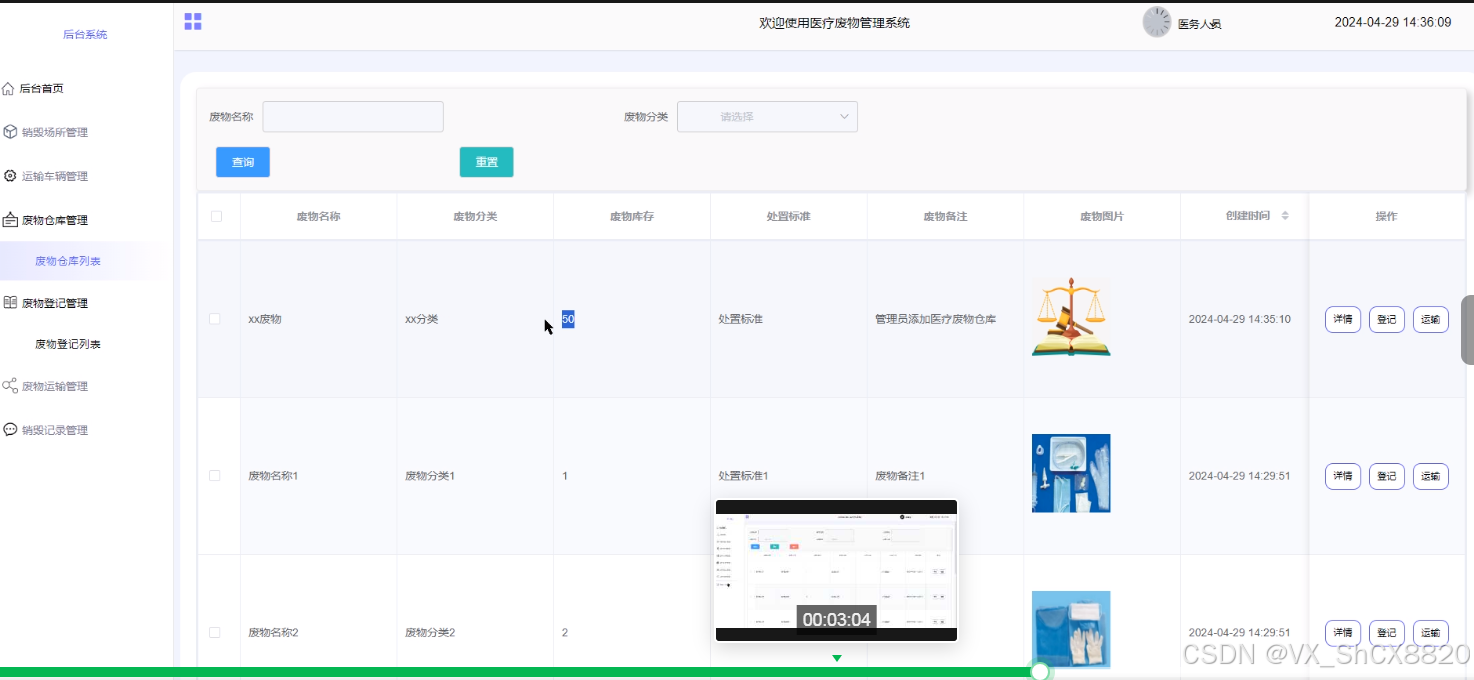 废物仓库管理:医务人员可以查看医疗废物的存储情况,包括废物的种类、数量、存放位置等信息。
