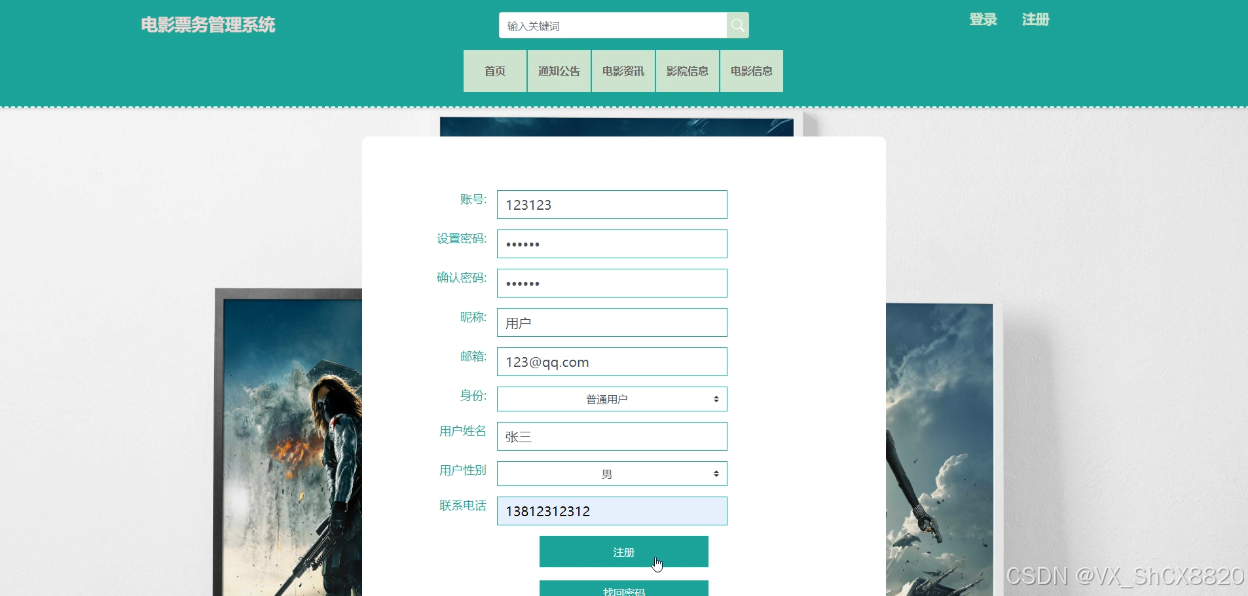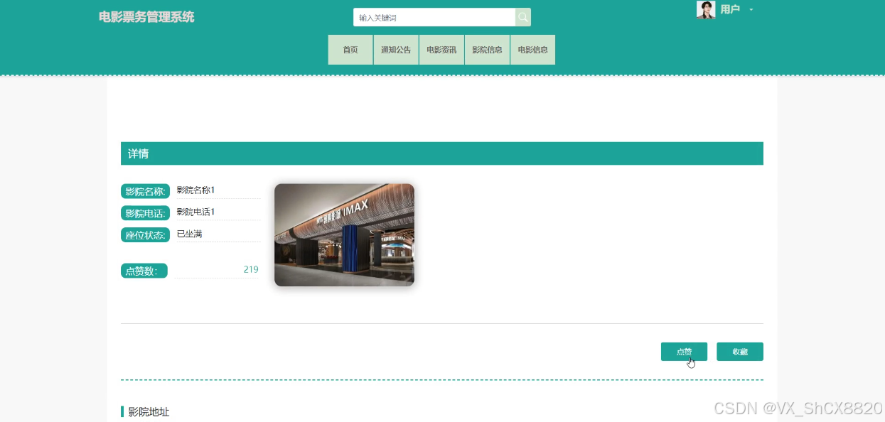 - 影院信息:普通用户可以搜索、浏览和查看影院信息,包括影院的影院名称、影院电话、座位状态、影院地址等。用户可以选择感兴趣的影院并查看更多详细信息。