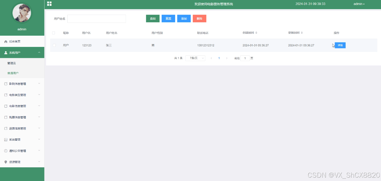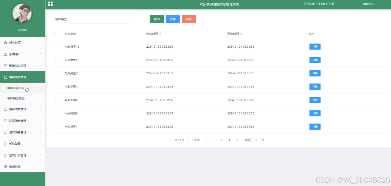 - 购票信息管理:管理员可以管理前台用户的购票信息,包括查询、重置和删除。点击详情可以查看到详细详细,如普通用户、用户姓名、电影名称、电影类型、电影票价、购票数量、合计金额、选定座位等。