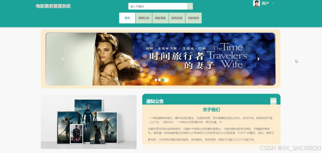 - 系统管理:管理员可以管理系统首页的轮播图,包括添加、编辑和删除轮播图的功能。轮播图用于展示热门电影、活动等重要信息,提高用户的注意度。