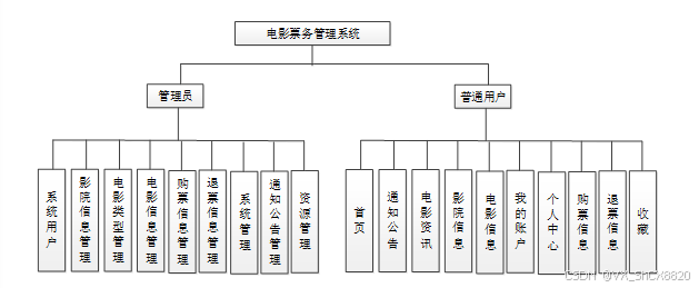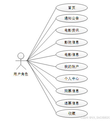 电影票务管理系统中,普通用户角色可以通过首页浏览、通知公告查看、电影资讯阅读、影院信息搜索和浏览、电影信息搜索、浏览、购票、点赞、收藏和评论、个人中心管理、购票信息管理、退票信息管理等功能,方便地浏览电影、购买电影票、管理个人信息和订单。管理员角色则负责系统用户管理、影院信息管理、电影类型管理、电影信息管理、购票信息管理、退票信息管理、系统管理、通知公告管理和资源管理等功能,以维护系统的运行和管理用户数据。通过这些功能的实现,系统能够提供便捷的电影票务服务,满足用户的需求,并为管理员提供了对系统内容和用户信息的管理能力。