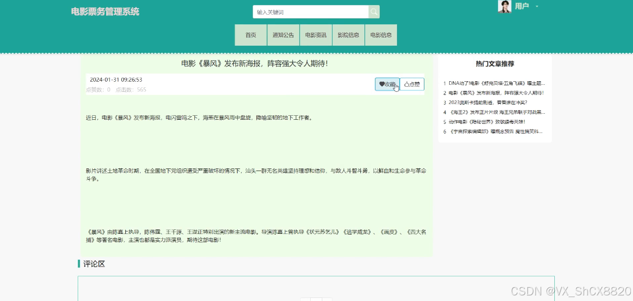 - 电影资讯阅读:普通用户可以阅读系统提供的电影资讯,包括新闻、访谈等内容。用户可以获取最新的电影相关信息,了解影片背景、制作花絮等。