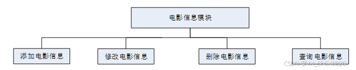 该模块主要包括电影的基本信息、上映时间、票价、剧情介绍、演员阵容等。用户可以通过浏览电影信息模块来获取感兴趣的电影信息,并了解相关的影片详情。管理员可以对电影信息进行添加、编辑和删除操作,确保电影信息的及时更新和准确性。电影信息模块的设计旨在为用户提供丰富的电影选择,方便用户购票和了解电影信息。具体的结构图如下: