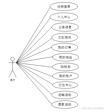 通过3.3功能的分析,得出了本文创产品销售系统的用例图: