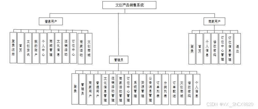 (2)系统用户:管理员可以对文创产品销售系统中所有的用户进行管控,包括了管理员,商家用户,普通用户。