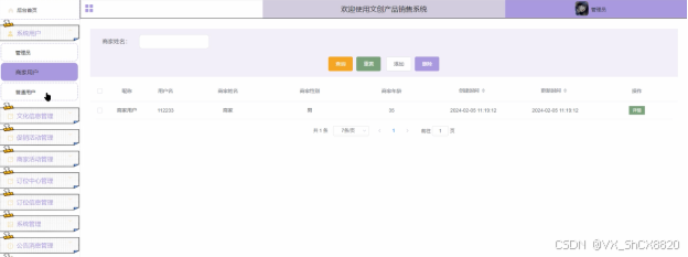 管理员可以对文创产品销售系统中所有的用户进行管控,包括了管理员,商家用户以及普通用户。界面如下图5-8所示。