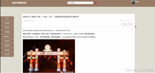 用户点击“文创资讯”菜单显示所有的文创资讯信息,可以按照条件进行文创资讯的筛选或者输入关键词进行局部搜索,点击可以进入文创资讯详细展示界面,在此界面用户可以收藏、点赞和评论,界面如下图5-4所示。