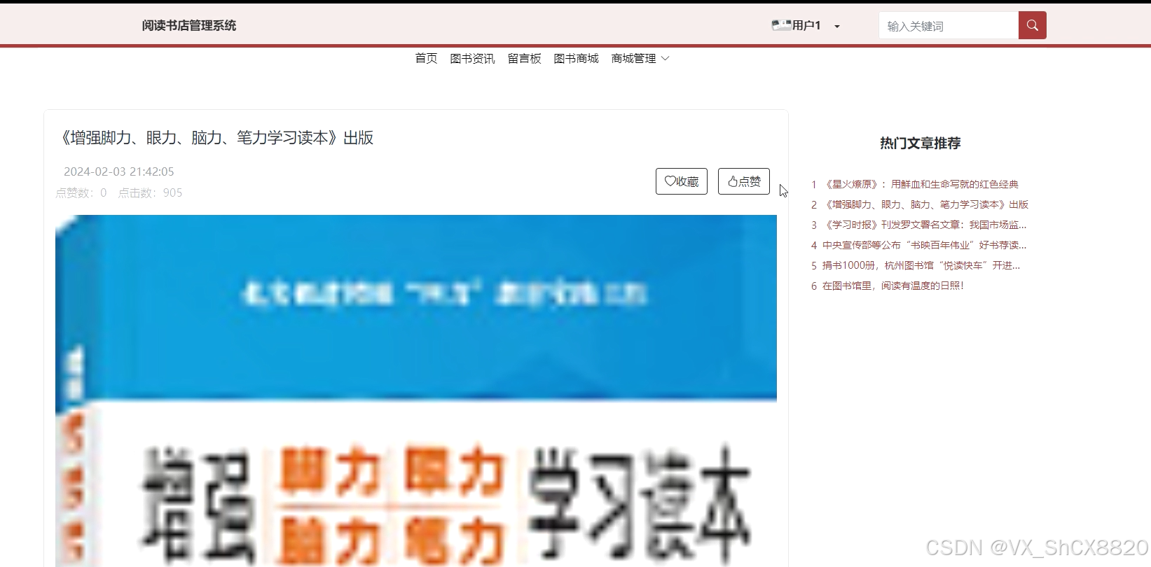 (3)图书资讯:在前台点击“图书资讯”按钮进入图书资讯列表,可以输入关键词进行查询图书资讯信息,并且可以对查看的图书资讯进行评论、收藏、点赞操作。