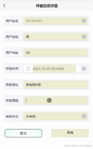 (4)呼救信息:点击“呼救信息”这一按钮可以查看到系统当中所有的呼救信息,支持通过用户姓名、审核状态进行查询,如果想要添加新的呼救信息,点击“添加”按钮,然后根据提示填写好呼救的具体信息,点击提交所添加的呼救信息在数据库就保存下来了,支持对用户提交的呼救信息进行审核。