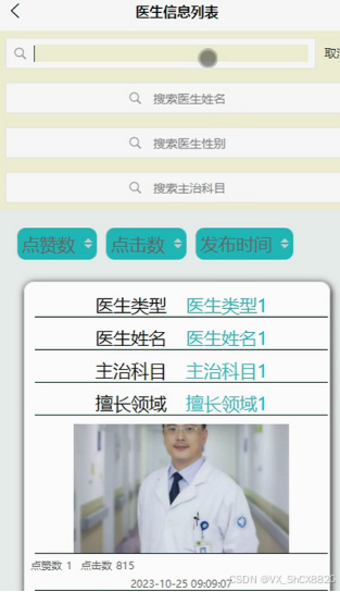 (4)医生信息:点击“医生信息”这个按钮发布用户可以提交医生信息,包含医生类型、医生姓名、医生性别、医生年龄、主治科目、从业时间、从业经历、擅长领域、联系方式、个人图片等信息;普通用户可以对医生信息进行查看,同时支持对医生信息进行点赞、收藏及评论。