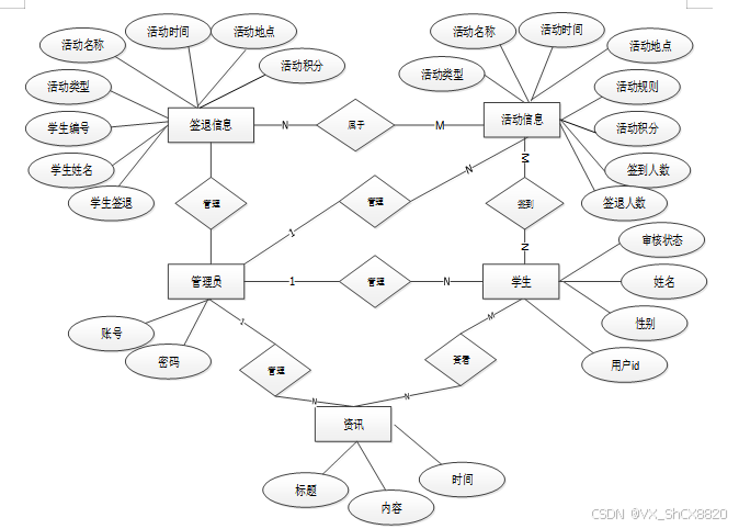 学生第二课堂积分管理小程序所拥有的数据表有以下:用户信息表、活动信息表、学生签到表,学生签退表。