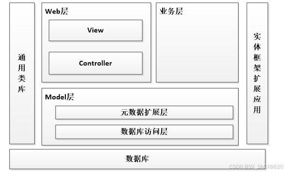 这款微信小程序的架构由三个部分组成:Web层、业务层、Model层。web层由View层、Controller层组成,而Model层则由元数据拓扑层、数据访问层组成。