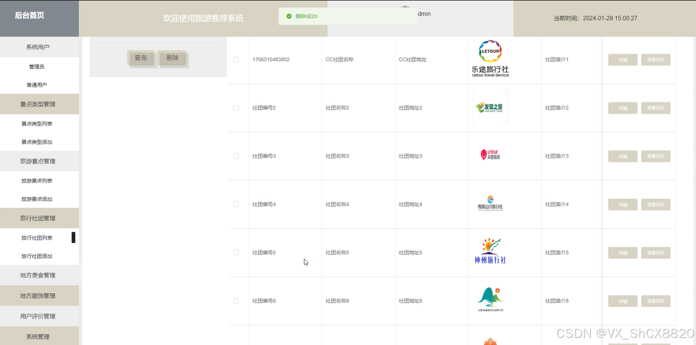 管理员点击左侧菜单“旅行社团管理”,页面跳转到旅行社团管理外观,调用后台景点查询所有旅行社团。并将信息密封到数据集合List,绑定到请求对象,然后页面跳转到相应的python页面,显示出旅行社团,单击删除按钮完成旅行社团的删除。