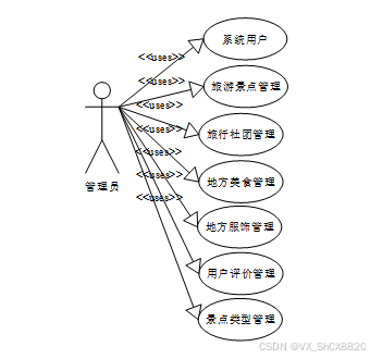 在后台,系统管理员扮演着不同的角色,分为管理员和普通用户。管理员主要负责对整个系统的管理和维护。他们可以管理用户信息,包括添加、删除和修改用户账户信息。管理员还可以管理景点类型,旅行社团,地方美食和地方服饰等相关信息,以保证系统数据的准确性和完整性。此外,管理员还可以对用户的评价和评论进行审核和管理,确保内容的真实性和合法性。同时,管理员还可以对旅游景点进行管理和维护,包括添加新的景点信息,更新现有景点的相关内容,并处理用户的投诉和问题。用户用例图如下所示。