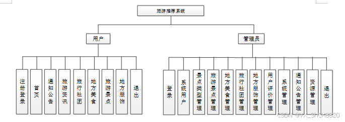 旅游推荐系统总体分为前台用户模块和后台管理员模块。