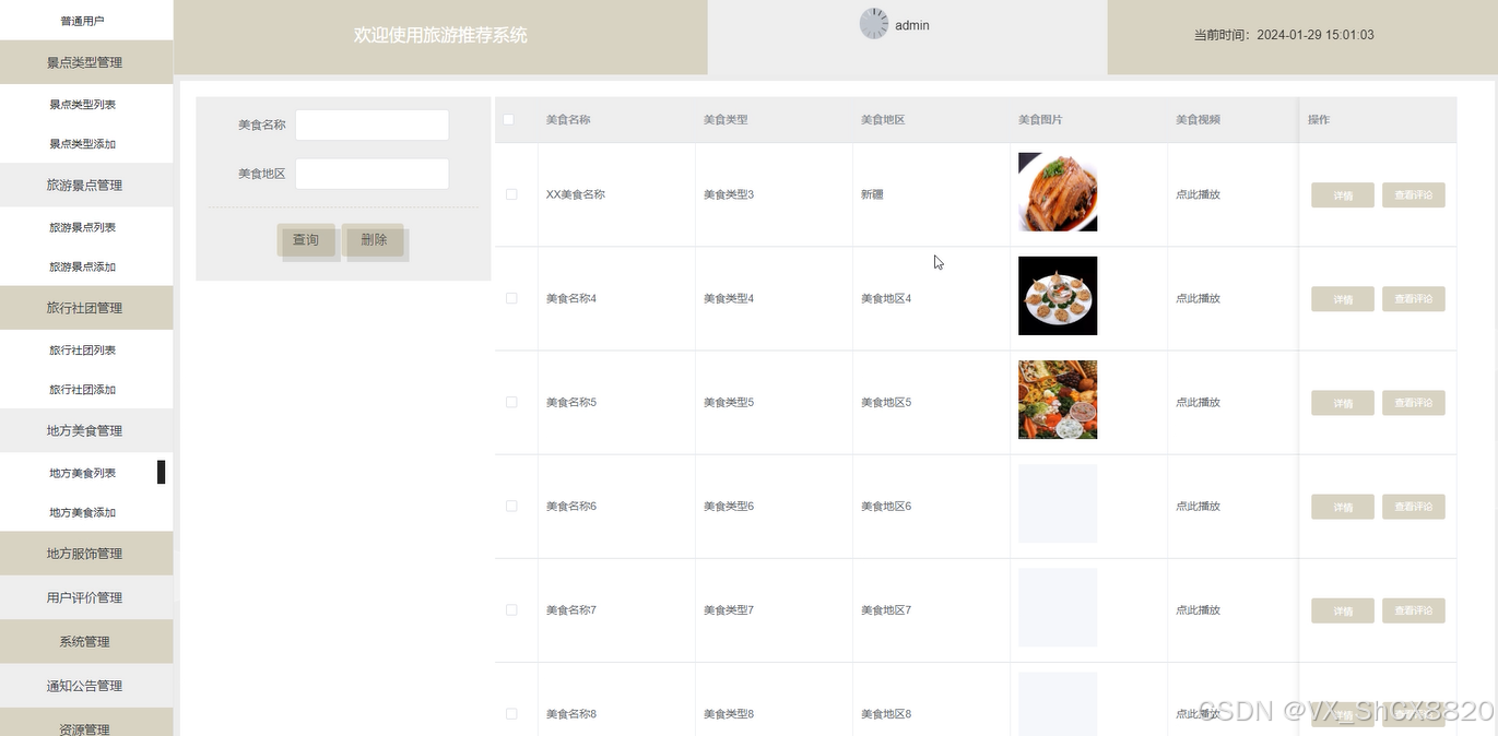 (3)地方美食:管理员点击“地方美食”菜单可以对地方美食进行增删改查。