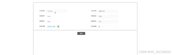 用户执行读者打赏,并可以操作相关内容,例如查看,编辑。读者打赏的添加操作是建立在电子小说的列表基础上,单击查看电子小说下的读者打赏链接;然后单击“读者打赏”进行添加,添加成功后的信息会载入到读者打赏查询列表中。