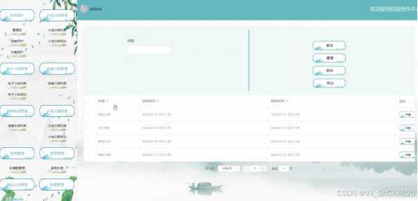 This platform is developed using the Spring Boot framework, leveraging its fast build and easy scalability features. The platform includes multiple functional modules, including reader tipping, system users, electronic novels, reader private messages, etc. The application of this reading and creative platform allows users to enjoy a rich and diverse reading experience, discover high-quality literary works, and communicate and interact with authors and other readers. For the author, the platform provides a broad creative stage, promoting the dissemination and sharing of works. With the support of Spring Boot, the platform has efficient performance and stability.
