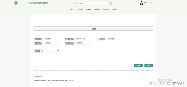 (5)考勤信息:在前台点击“考勤信息”按钮进入考勤信息列表,用户可以选中某一考勤信息查看详情包括考勤名称、生效日期、上班时间、下班时间、休假时间、迟到规定等内容,也可以进行收藏、点赞、评论等。