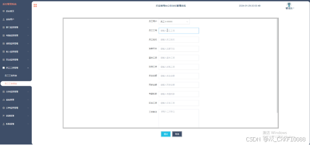 管理员点击“员工工资管理”会显示出员工用户所有的员工工资信息列表,也可以添加新的员工工资信息。员工工资信息添加界面如下图5-15所示。