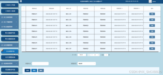 管理员点击“安全预警”会显示出所有的安全预警信息,支持输入预警地点或者预警时间对安全预警信息进行查询,可以选择某一条安全预警信息,点击“删除”进行删除,具体的实现界面如下图: