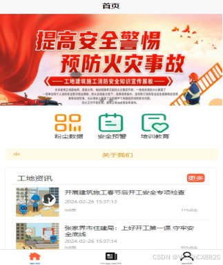 (1)用户查看系统信息功能需求:用户可以通过系统首页查看建筑工地员工安全预警APP,包括首页,工地资讯、粉尘数据、安全预警、培训教育。