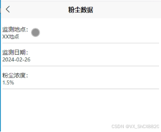 (2)粉尘数据:用户点击“粉尘数据”菜单可以查看所有粉尘数据信息,可以按照条件查看粉尘数据,或者输入关键词进行查询,点击可以进入粉尘数据详细展示界面。