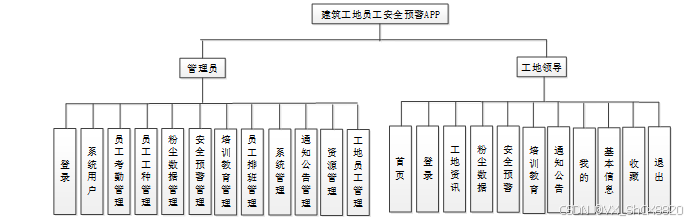(3)确定好系统使用的技术,进行在线确认系统所划分的用户角色,并且根据用户角色划分确定所要设计的功能模块,对建筑工地员工安全预警APP的设计主要划分别为管理员和用户角色对于系统员工用户可以根据自己的分管内容进行在线信息的处理及操作,管理员获取到所有用户的详细数据信息,并根据需求进行第一时间处理解决。
