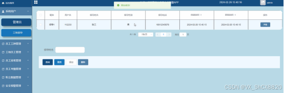 管理员点击“工地员工”会显示出所有的工地员工信息,支持输入员工姓名或者员工性别对工地员工信息进行查询,可以选择某一条工地员工信息,点击“删除”进行删除,也可以点击后面的“排班”“考勤”按钮对工地员工的排班/考勤信息进行更新维护,具体的实现界面如下图: