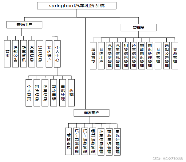 汽车租赁系统的开发主要是解放双手,提高效率,为企业的发展进行添砖加瓦,所以在系统的功能方面我们首先要从企业管理的角度进行,然后再从用户的角度进行,确保能够满足每个用户的需求,因此在功能上主要规划了普通用户、商家用户和管理员三大部分,实现了注册登录、用户管理、汽车类型管理、汽车信息管理、租赁信息管理、还车信息管理、事故申诉管理、申诉处理管理、等功能。