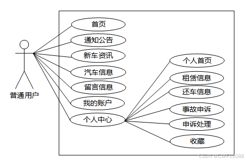 汽车租赁系统中普通用户角色功能包含了首页、通知公告、新车资讯、汽车信息、留言信息、我的账户、个人中心(个人首页、租赁信息、还车信息、事故申诉、申诉处理、收藏)等功能,普通用户的用例图如图3.1所示: