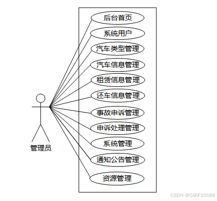汽车租赁系统中管理员角色功能包含了后台首页、系统用户、汽车类型管理、汽车信息管理、租赁信息管理、还车信息管理、事故申诉管理、申诉处理管理、系统管理、留言管理、通知公告管理、资源管理等功能,管理员的用例图如图3.3所示: