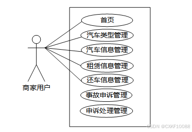 租赁信息管理、还车信息管理、事故申诉管理、申诉处理管理等功能,商家用户的用例图如图3.2所示: