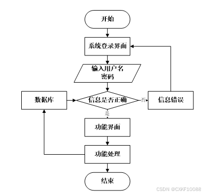 用户打开并进入系统后,会先显示登录界面,输入正确的用户名和密码,系统自动检测信息,若信息无误,则用户会进入系统功能界面,进行操作,否则会提示错误无法登录,操作流程如图3-3所示。