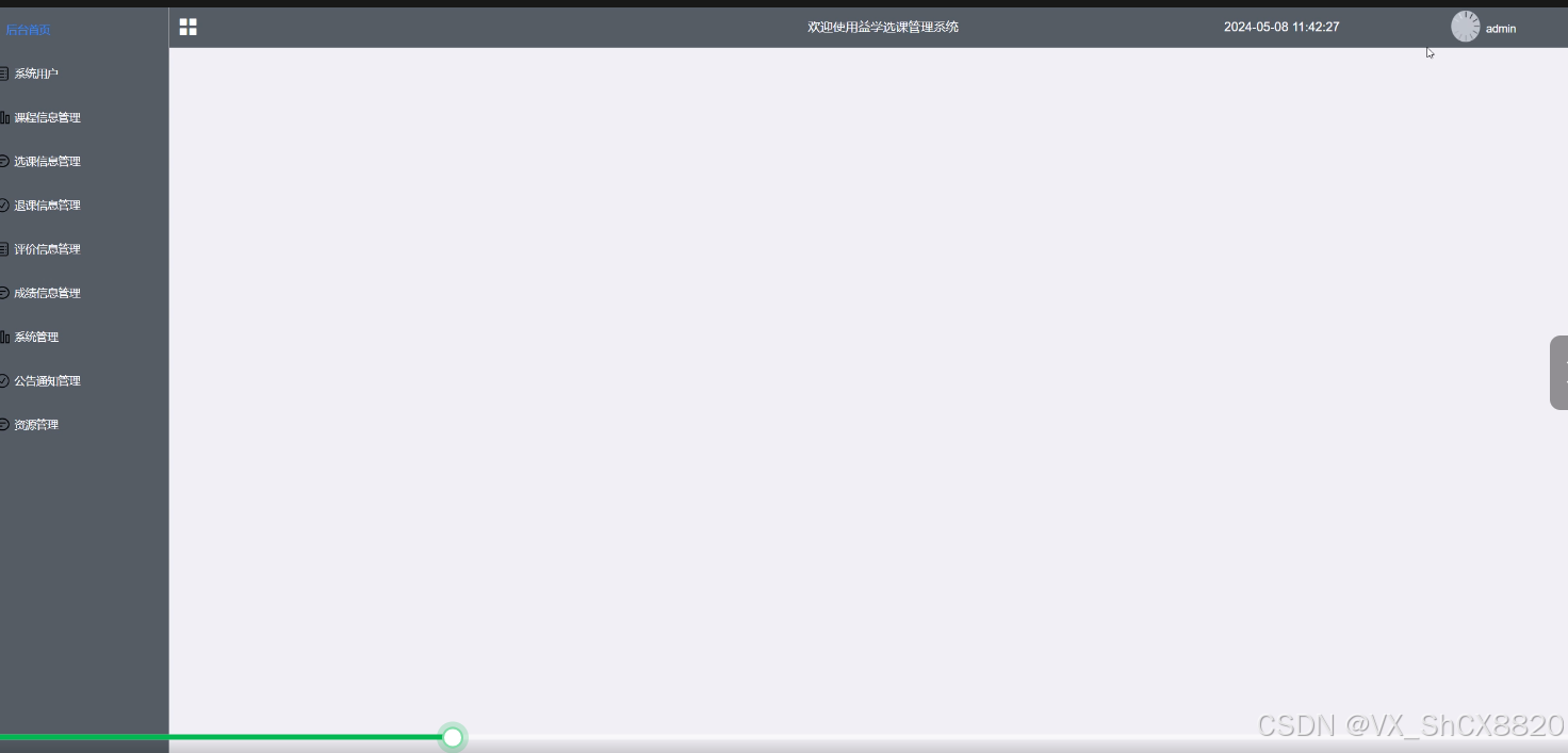进入系统后首先要进行登录,验证你的身份,赋予你不同的权限。当你成功登录后,页面会有多个板块,分别是后台首页、系统用户、课程信息管理、选课信息管理、退课信息管理、评价信息管理、成绩信息管理、系统管理、公告通知管理、资源管理。里面界面简单易懂,根据标示可以直接进行方便快捷的操作。
