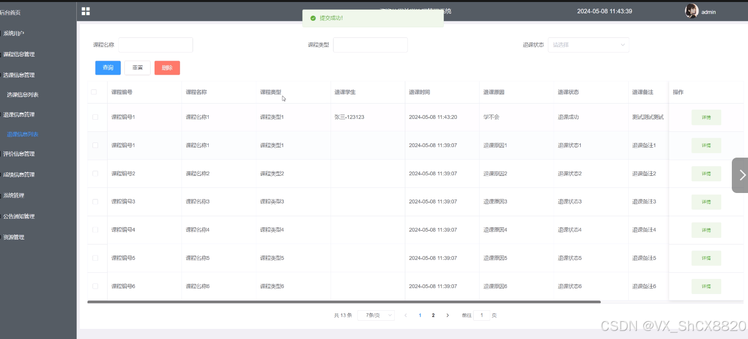 允许管理员查看和管理学生的退课信息,包括退课时间、退课原因等。提供退课信息的查询、审核、编辑和删除功能,确保退课过程的准确性。界面如下图所示。