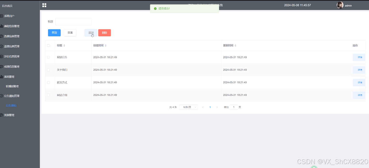 管理员可以对系统前台展示的通知公告进行增删改查,方便用户进行查看。公告通知管理界面如下图所示。