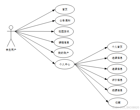 学生用户角色的用例包括首页、公告通知、校园资讯、课程信息、我的账户、个人中心(个人首页、选课信息、退课信息、评价信息、成绩信息、收藏)。