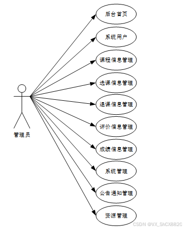 管理员角色的用例包括后台首页、系统用户、课程信息管理、选课信息管理、退课信息管理、评价信息管理、成绩信息管理、系统管理、公告通知管理、资源管理。
