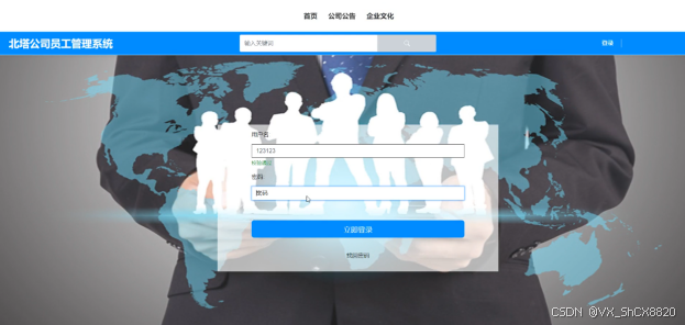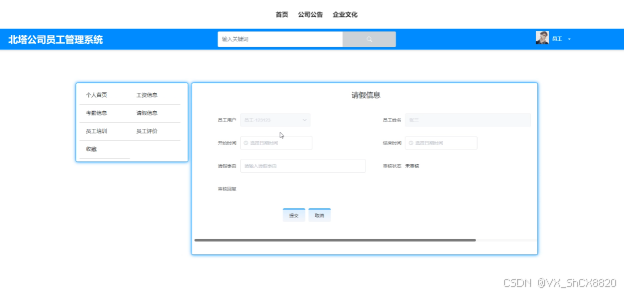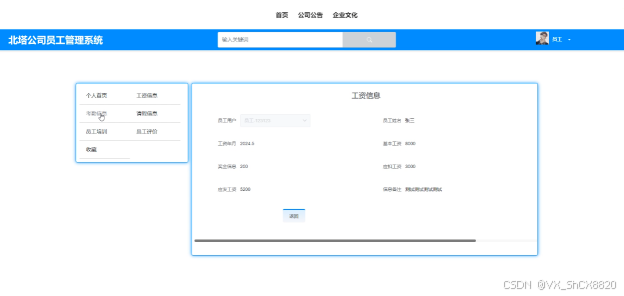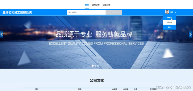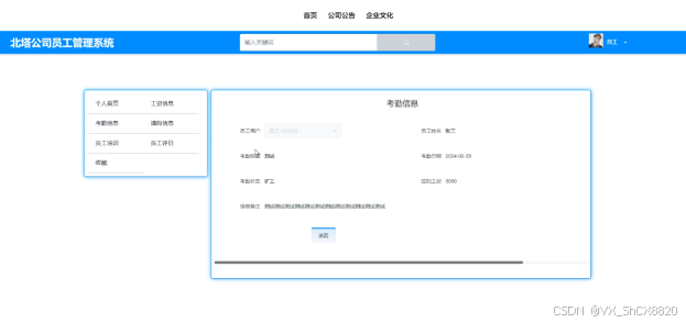 (2)查看北塔公司员工管理系统的首页信息:北塔公司员工管理系统的首页信息包含了首页、公司公告、企业文化、我的账户、个人中心等。